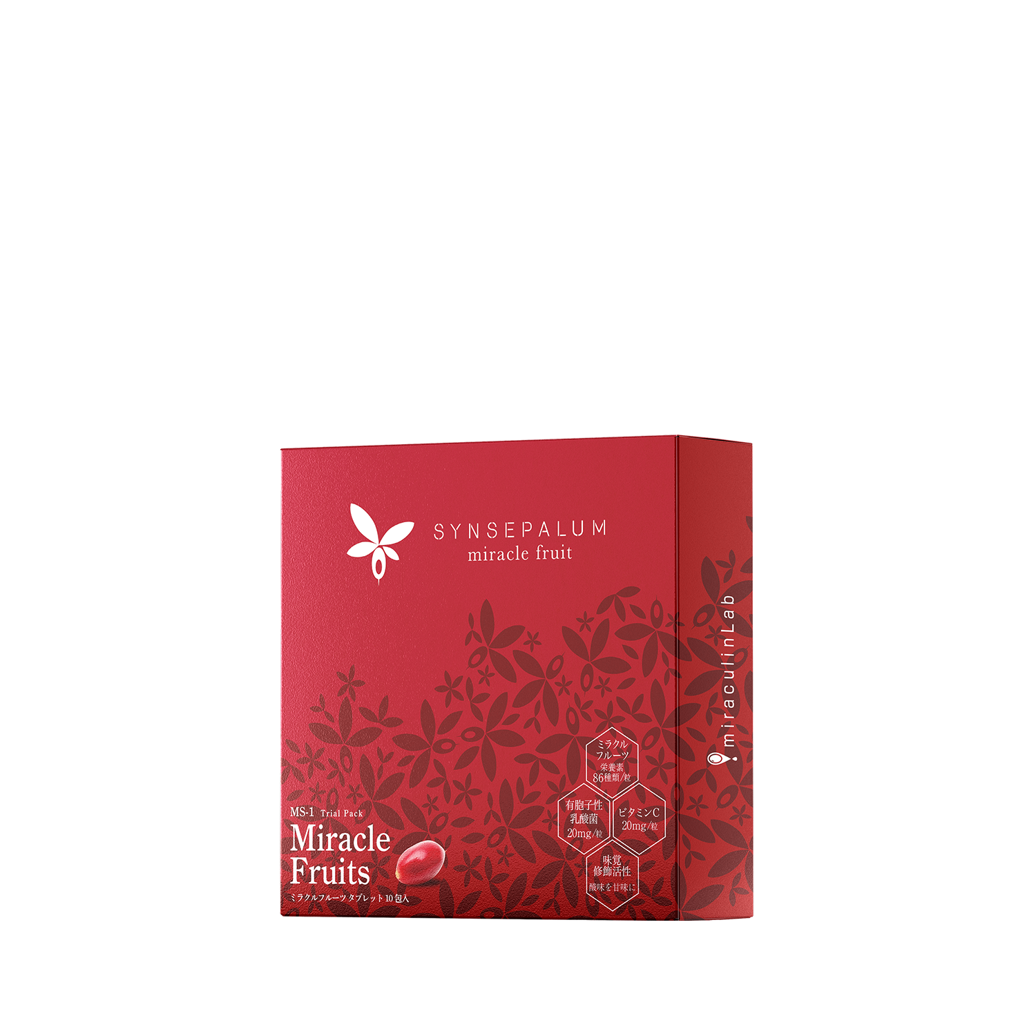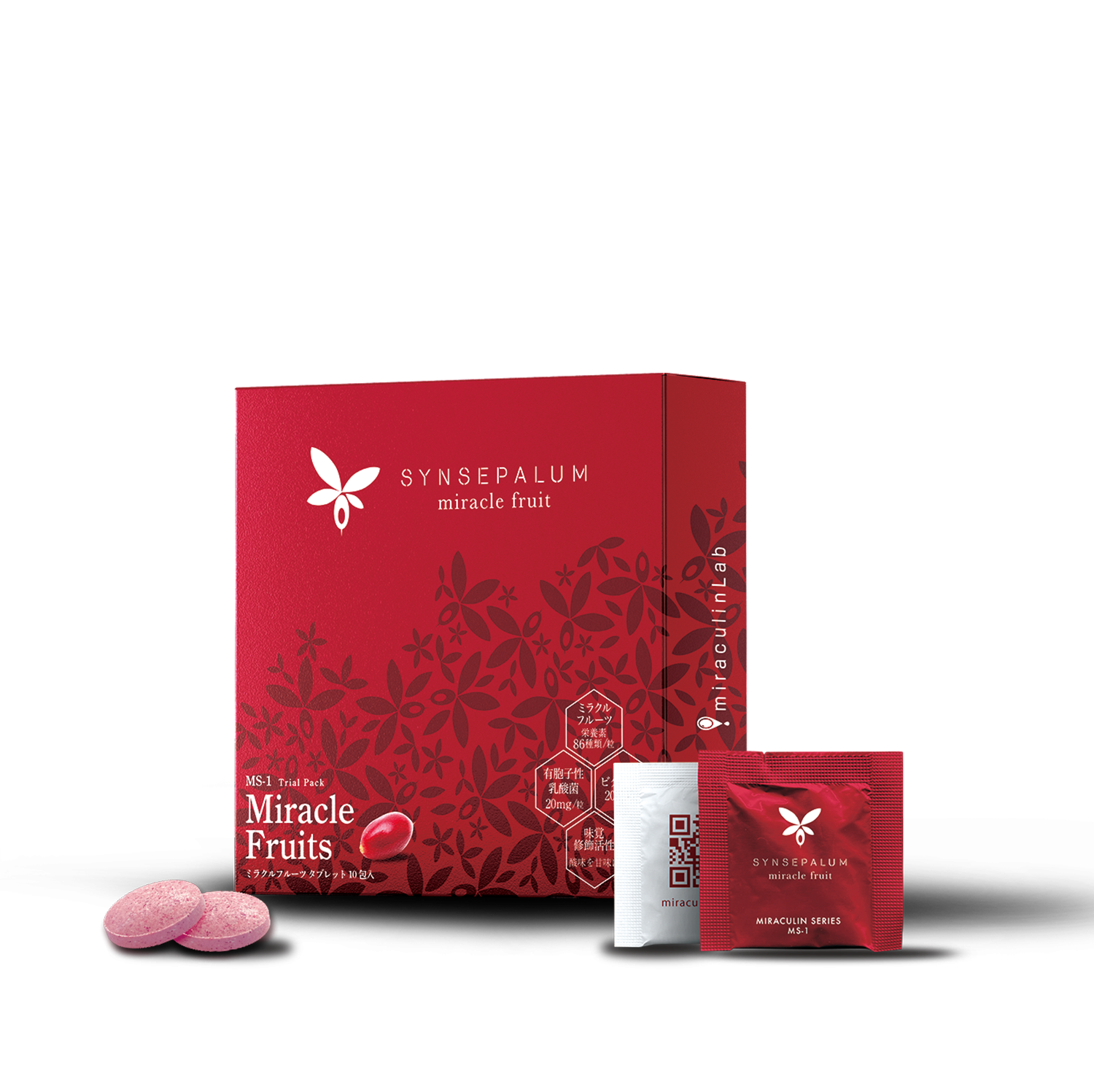 | 《原材料名》 | シンセパルムデュルシフィクム ( ミラクルフルーツ ) 粉末 ( 国内製造 )、還元麦芽糖水飴、還元パラチノース、エリスリトール、乳糖、有胞子性乳酸菌 /ステアリン酸カルシウム、ビタミンC、糊料 (CMC-Ca)、微粒二酸化ケイ素、アセロラ香料、糊料 ( プルラン ) |